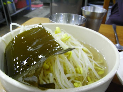 夜中に降っていた雨もやみ、ネットで見たお店を探す。カタコトのハングルで道を聞く。3人目のおじさんが店が見えるところまで案内してくれた。朝早くから、次々に客が出入りする人気の店。ウェイン トゥナムルクッパという店。豆もやしがたっぷり入ったクッパとスープ。クッパにはのりとたまごを入れて食べる。もやしがシャキシャキ、スープもいい味。これで約1120円(二人分)